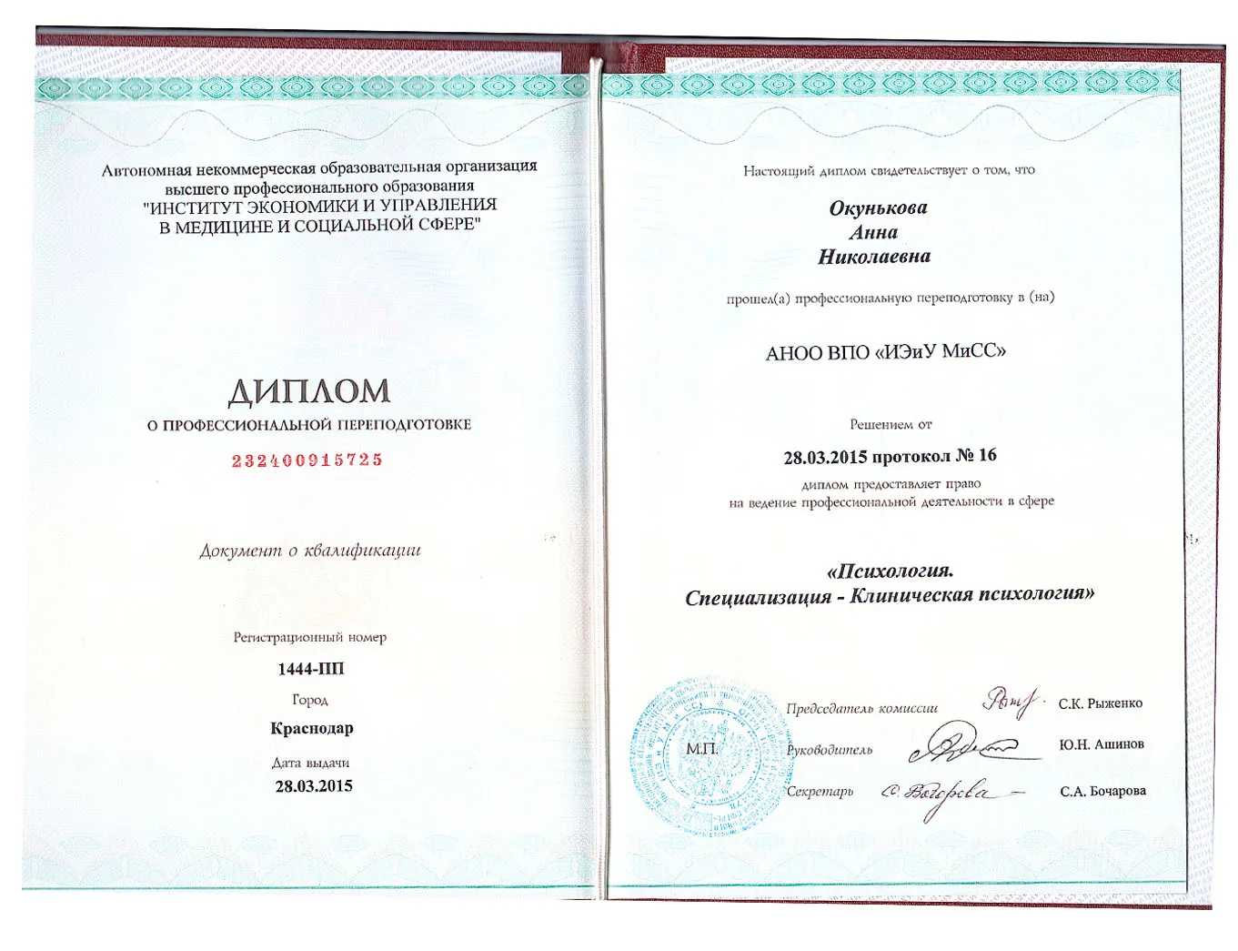 • 2015 - Институт экономики и управления в медицине и социальной сфере ( Диплом о профессиональной переподготовке по программе "Психология. Специализация - Клиническая психология")